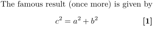 The famous result (once more) is given by \startplaceformula \startformula c^2 = a^2 + b^2 \stopformula \stopplaceformula