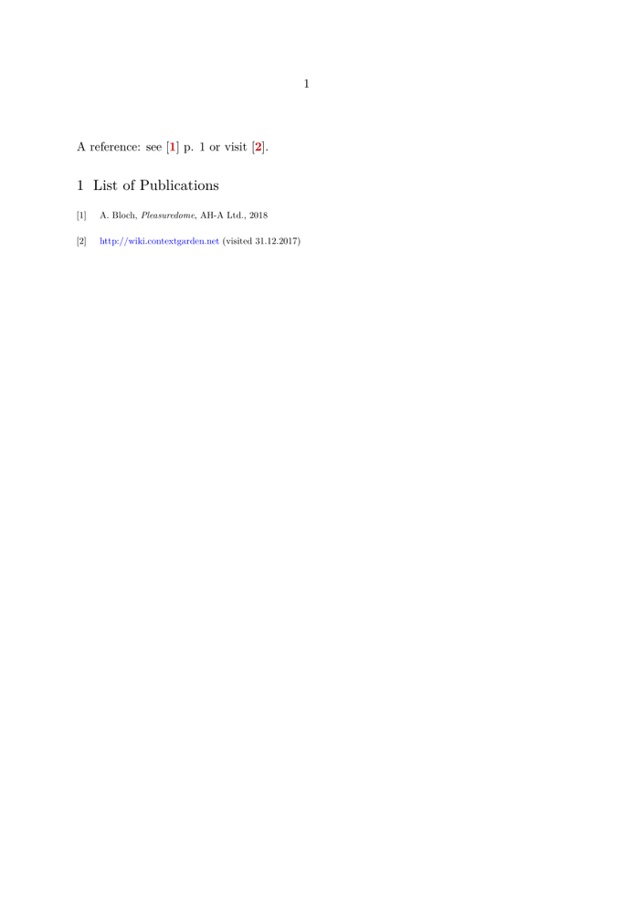 \define[1]\Lnk {\[\in[#1]\]} \setupinteraction[state=start] \starttext %\startbodymatter A reference: see \Lnk{libA} p. 1 or visit \Lnk{libB}. %\stopbodymatter %\startappendices \startsection[title={List of Publications}] % in appendices use chapter instead of section! {\tfx \startitemize[n][stopper={},left={\[},right={\]},distance=1em] \startitem[libA] A. Bloch, {\it Pleasuredome}, AH-A Ltd., 2018 \stopitem \startitem[libB] {\blue http://wiki.contextgarden.net} (visited 31.12.2017) \stopitem \stopitemize } \stopsection %\stopappendices \stoptext