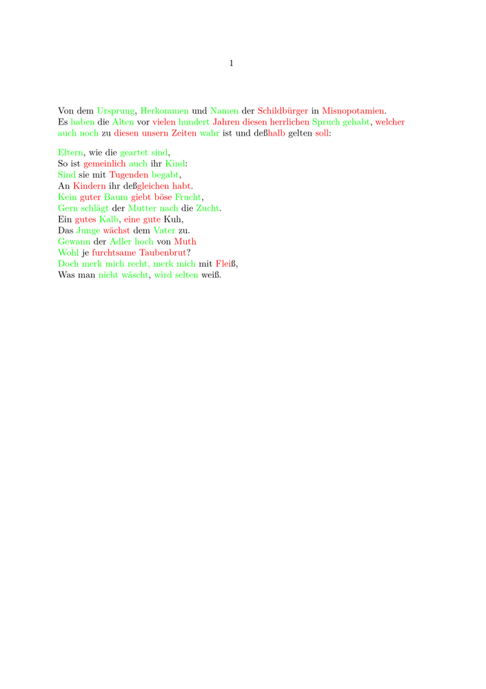 \setupcolors[state=start] \loadspellchecklist[de][words-de.txt] \setupspellchecking[state=start] \mainlanguage[de] \starttext Von dem Ursprung, Herkommen und Namen der Schildbürger in Misnopotamien. Es haben die Alten vor vielen hundert Jahren diesen herrlichen Spruch gehabt, welcher auch noch zu diesen unsern Zeiten wahr ist und deßhalb gelten soll: \startlines Eltern, wie die geartet sind, So ist gemeinlich auch ihr Kind: Sind sie mit Tugenden begabt, An Kindern ihr deßgleichen habt. Kein guter Baum giebt böse Frucht, Gern schlägt der Mutter nach die Zucht. Ein gutes Kalb, eine gute Kuh, Das Junge wächst dem Vater zu. Gewann der Adler hoch von Muth Wohl je furchtsame Taubenbrut? Doch merk mich recht, merk mich mit Fleiß, Was man nicht wäscht, wird selten weiß. \stoplines \stoptext