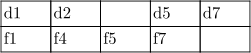 \setuppapersize[A5] \bTABLE[width=3em] \bTR\bTD d1 \eTD\bTD[n=2] d2 \eTD\bTD[n=5] d5 \eTD\bTD[n=7] d7 \eTD\eTR \bTR\bTD f1 \eTD\bTD[n=4] f4 \eTD\bTD[n=5] f5 \eTD\bTD[n=7] f7 \eTD\eTR \eTABLE