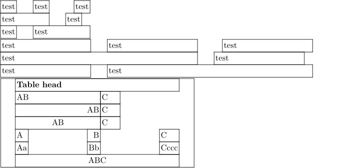 \setuppapersize[A5] % distance mechanism, per column (H) \start \setupTABLE[c][1][distance=2em] \setupTABLE[c][2][distance=3em] \bTABLE \bTR \bTD test \eTD \bTD test \eTD \bTD test \eTD \eTR \bTR \bTD[nx=2] test \eTD \bTD test \eTD \eTR \bTR \bTD test \eTD \bTD[nx=2] test \eTD \eTR \eTABLE \bTABLE[option=stretch] \bTR \bTD test \eTD \bTD test \eTD \bTD test \eTD \eTR \bTR \bTD[nx=2] test \eTD \bTD test \eTD \eTR \bTR \bTD test \eTD \bTD[nx=2] test \eTD \eTR \eTABLE \stop % distance mechanism, per table (V) \framed[offset=none]{% \setupTABLE[column][2][align=left] \setupTABLE[column][3][align=right] \bTABLE[columndistance=2cm,leftmargindistance=.3cm,rightmargindistance=.5cm] \bTR \bTH[nc=3] Table head\eTH \eTR \bTR\bTD[nc=2] AB\eTD\bTD C\eTD\eTR \bTR\bTD[nc=2,align=left] AB\eTD\bTD C\eTD\eTR \bTR\bTD[nc=2,align=middle] AB\eTD\bTD C\eTD\eTR \bTR\bTD A\eTD\bTD B\eTD\bTD C\eTD\eTR \bTR\bTD Aa\eTD\bTD Bb\eTD\bTD Cccc\eTD\eTR \bTR\bTD[nc=3,align=middle] ABC\eTD\eTR \eTABLE }