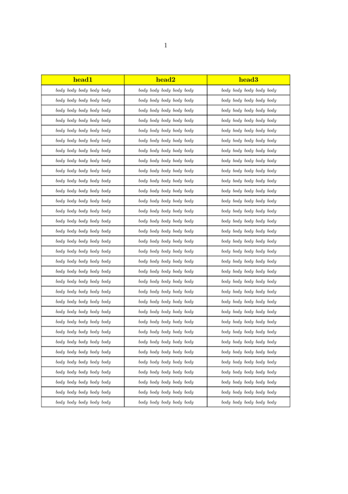 \starttext \setupcolors[state=start] % setup for all cells \setupTABLE[r][each][style=\tfx\it, align=center] % setup table head \setupTABLE[r][first] [background=color, backgroundcolor=yellow] % setup table footer \setupTABLE[r][last] [style=bold, background=color, backgroundcolor=green] \bTABLE[split=repeat,option=stretch]% head on every page, stretch columns % % IMPORTANT: use \bTH ... \eTH to enclose the head|next cells \bTABLEhead \bTR \bTH head1 \eTH \bTH head2 \eTH \bTH head3 \eTH \eTR \eTABLEhead % \bTABLEnext % setup for next table head \bTR [background=color,backgroundcolor=cyan] \bTH next1 \eTH \bTH next2 \eTH \bTH next3 \eTH \eTR \eTABLEnext % % the table body (main part) % \bTABLEbody % \dorecurse{100}{% 100 rows \bTR \bTC body body body body body \eTC \bTC body body body body body \eTC \bTC body body body body body \eTC \eTR }% % \eTABLEbody % % the table foot % \bTABLEfoot \bTR \bTC foot1 \eTC \bTC foot2 \eTC \bTC foot3 \eTC \eTR \eTABLEfoot % \eTABLE \stoptext