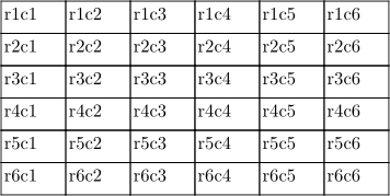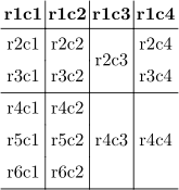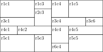 \bTABLE \bTR \bTD \bf r1c1 \eTD \bTD \bf r1c2 \eTD \bTD \bf r1c3 \eTD \bTD \bf r1c4 \eTD \eTR \bTR \bTD r2c1 \eTD \bTD r2c2 \eTD \bTD[nr=2] r2c3 \eTD \bTD r2c4 \eTD \eTR \bTR \bTD r3c1 \eTD \bTD r3c2 \eTD \bTD r3c4 \eTD \eTR \bTR \bTD r4c1 \eTD \bTD r4c2 \eTD \bTD[nr=3] r4c3 \eTD \bTD[nr=3] r4c4 \eTD \eTR \bTR \bTD r5c1 \eTD \bTD r5c2 \eTD \eTR \bTR \bTD r6c1 \eTD \bTD r6c2 \eTD \eTR \eTABLE |