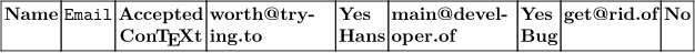 % some additional settings for the table may be made as well \setupTABLE[c][2][style=\tt] \setupTABLE[c][3][align=middle] \setupTABLE[r][1][style=bold] % how to override the \tt in the second column? \startCSV Name,Email,Accepted \CONTEXT,worth@trying.to,Yes Hans,main@developer.of,Yes Bug,get@rid.of,No \stopCSV