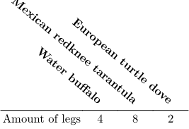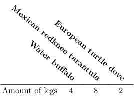 \bTABLE[frame=off] \bTR[align={middle,low}] \bTH \eTH \bTH \dontleavehmode\kern1.5em\llap{\rotate[rotation=320]{\strut Water buffalo}} \eTH \bTH \dontleavehmode\kern1.5em\llap{\rotate[rotation=320]{\strut Mexican redknee tarantula}} \eTH \bTH \dontleavehmode\kern1.5em\llap{\rotate[rotation=320]{\strut European turtle dove}} \eTH \eTR \bTR[topframe=on,align=middle] \bTD Amount of legs \eTD \bTD[width=3em] 4 \eTD \bTD[width=3em] 8 \eTD \bTD[width=3em] 2 \eTD \eTR \eTABLE