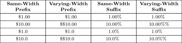 % mode=mkiv \setuppapersize[A5] \bTABLE \setupTABLE[c][1,2,3,4][alignmentcharacter={text->.},aligncharacter=yes,align=middle] \bTABLEhead \bTR \bTH Same-Width Prefix \eTH \bTH Varying-Width Prefix \eTH \bTH Same-Width Suffix \eTH \bTH Varying-Width Suffix \eTH \eTR \eTABLEhead \bTABLEbody \bTR \bTD \$1.00 \eTD \bTD \$1.00 \eTD \bTD 1.00\% \eTD \bTD 1.00\% \eTD \eTR \bTR \bTD \$10.00 \eTD \bTD \$\$10.00 \eTD \bTD 10.00\% \eTD \bTD 10.00\%\% \eTD \eTR \bTR \bTD \$1.0 \eTD \bTD \$1.0 \eTD \bTD 1.0\% \eTD \bTD 1.0\% \eTD \eTR \bTR \bTD \$10.0 \eTD \bTD \$\$10.0 \eTD \bTD 10.0\% \eTD \bTD 10.0\%\% \eTD \eTR \eTABLEbody \eTABLE