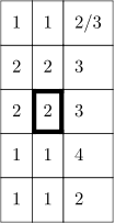 \setupTABLE[row][each][rulethickness=.25pt,offset=\dimexpr1mm+1.75pt] \bTABLE \bTR \bTD 1 \eTD \bTD 1 \eTD \bTD 2/3 \eTD \eTR \bTR \bTD 2 \eTD \bTD 2 \eTD \bTD 3 \eTD \eTR \bTR \bTD 2 \eTD \bTD[rulethickness=2pt,offset=1mm] 2 \eTD \bTD 3 \eTD \eTR \bTR \bTD 1 \eTD \bTD 1 \eTD \bTD 4 \eTD \eTR \bTR \bTD 1 \eTD \bTD 1 \eTD \bTD 2 \eTD \eTR \eTABLE