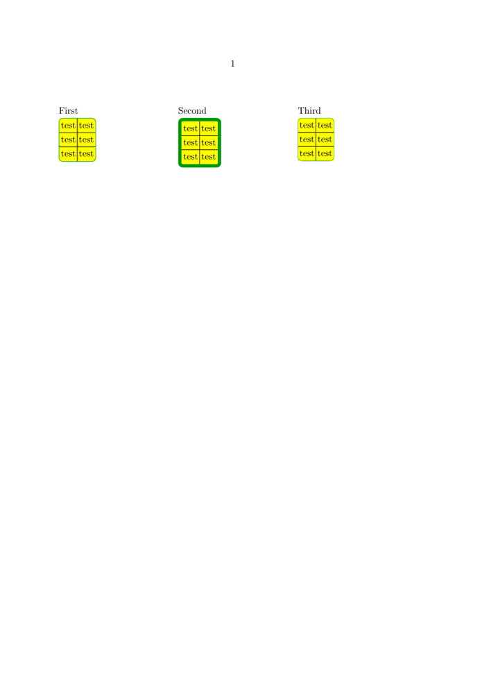 \starttext \setupcolors[state=start] %\showstruts \setupTABLE[background=color,backgroundcolor=yellow] \setupframed[framecolor=darkgreen] \defineparagraphs[ThreeCols] \startThreeCols First \def\StartTable {\setupTABLE[row] [first][topframe=off]% \setupTABLE[row] [last] [bottomframe=off]% \setupTABLE[column][first][leftframe=off]% \setupTABLE[column][last] [rightframe=off]% \framed[strut=no,corner=round,offset=.5\linewidth] \bgroup} \def\StopTable {\egroup} \StartTable \bTABLE \bTR \bTD test \eTD \bTD test \eTD \eTR \bTR \bTD test \eTD \bTD test \eTD \eTR \bTR \bTD test \eTD \bTD test \eTD \eTR \eTABLE \StopTable \nextThreeCols Second \setupTABLE[row] [first][topframe=off] \setupTABLE[row] [last] [bottomframe=off] \setupTABLE[column][first][leftframe=off] \setupTABLE[column][last] [rightframe=off] \framed[strut=no,corner=round,offset=.5\linewidth,,rulethickness=1mm]\bgroup \bTABLE \bTR \bTD test \eTD \bTD test \eTD \eTR \bTR \bTD test \eTD \bTD test \eTD \eTR \bTR \bTD test \eTD \bTD test \eTD \eTR \eTABLE \egroup \nextThreeCols Third \setupTABLE[row] [first][topframe=off] \setupTABLE[row] [last] [bottomframe=off] \setupTABLE[column][first][leftframe=off] \setupTABLE[column][last] [rightframe=off] \framed[strut=no,corner=round, radius=1.4mm,offset=-1mm,,rulethickness=.1mm]\bgroup \framed[strut=no,corner=round, radius=1.5mm,offset=0mm,,rulethickness=1mm,framecolor=white]\bgroup \bTABLE \bTR \bTD test \eTD \bTD test \eTD \eTR \bTR \bTD test \eTD \bTD test \eTD \eTR \bTR \bTD test \eTD \bTD test \eTD \eTR \eTABLE \egroup \egroup \stopThreeCols \stoptext