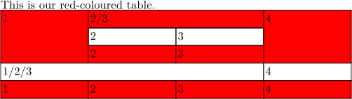 This is our red-coloured table. \setupcolors[state=start] \setupTABLE[row][odd][background=color,backgroundcolor=red, width=.2\textwidth] \bTABLE[split=yes] % allow splitting over page boundaries \bTR \bTD[nr=3] 1 \eTD \bTD[nc=2] 2/3 \eTD \bTD[nr=3] 4 \eTD \eTR \bTR \bTD 2 \eTD \bTD 3 \eTD \eTR \bTR \bTD 2 \eTD \bTD 3 \eTD \eTR \bTR \bTD[nc=3] 1/2/3 \eTD \bTD 4 \eTD \eTR \bTR \bTD 1 \eTD \bTD 2 \eTD \bTD 3 \eTD \bTD 4 \eTD \eTR \eTABLE
