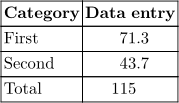 \bTABLE \setupTABLE[column][1][align=right] \setupTABLE[column][2][alignmentcharacter={.}, aligncharacter=yes,align=middle] \bTR \bTH Category \eTH \bTH Data entry \eTH \eTR \bTR \bTD First \eTD \bTD 71.3 \eTD \eTR \bTR \bTD Second \eTD \bTD 43.7 \eTD \eTR \bTR \bTD Total \eTD \bTD 115 \eTD \eTR \eTABLE |