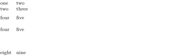 \starttabulate \NC one \NC two \NC\NR \NC two \NC three \NC\NR \TB[halfline] \NC four \NC five \NC\NR \TB[line] \NC four \NC five \NC\NR \TB[1cm] \NC eight \NC nine \NC\NR \stoptabulate