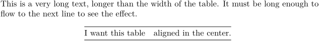 This is a very long text, longer than the width of the table. It must be long enough to flow to the next line to see the effect. \startplacetable[location=force,number=no] \starttabulate[|r|l|] \HL \NC I want this table \NC aligned in the center.\NC\NR \HL \stoptabulate \stopplacetable
