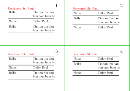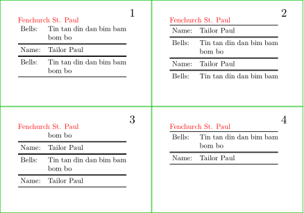 \setuppapersize[A10,landscape][A8,landscape] \setuppaper[nx=2,ny=2] \setuparranging[XY] \switchtobodyfont[5pt] \setuppagenumbering[location={header,inright}] \showframe[edge] \setuptabulate [split=yes, header=text, title={\color[red]{Fenchurch St. Paul}}, frame=on] \starttext \starttabulate \dorecurse{6}{ \NC Bells: \NC Tin tan din dan bim bam bom bo \NC\NR \HL \NC Name: \NC Tailor Paul \NC \NR \HL} \stoptabulate \stoptext