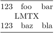 \starttabulate[|r|l|c|] \HL \NC 123 \NC foo \NC bar \NC\NR \NS[2][c] LMTX \NC\NR \NC 123 \NC baz \NC bla \NC\NR \HL \stoptabulate