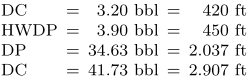 \starttabulate[|l|r|r|][EQ={=}] \NC DC \EQ 3.20 bbl \EQ 420 ft \NC\NR \NC HWDP \EQ 3.90 bbl \EQ 450 ft \NC\NR \NC DP \EQ 34.63 bbl \EQ 2.037 ft \NC\NR \NC DC \EQ 41.73 bbl \EQ 2.907 ft \NC\NR \stoptabulate