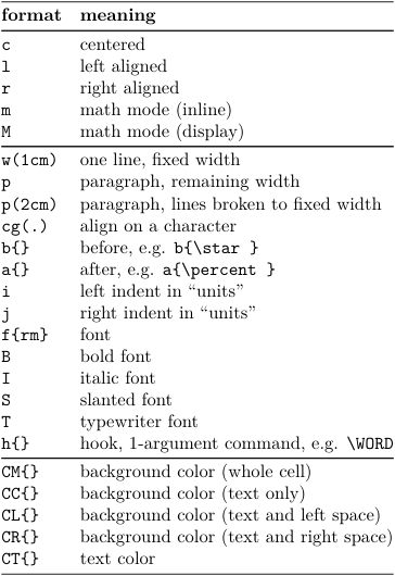 \starttabulate[|lT|l|] \HL \NC {\rm\bf format} \NC {\bf meaning} \NC\NR \HL \NC c \NC centered \NC\NR \NC l \NC left aligned \NC\NR \NC r \NC right aligned \NC\NR \NC m \NC math mode (inline) \NC\NR \NC M \NC math mode (display) \NC\NR \HL \NC w(1cm) \NC one line, fixed width \NC\NR \NC p \NC paragraph, remaining width \NC\NR \NC p(2cm) \NC paragraph, lines broken to fixed width \NC\NR \NC cg(.) \NC align on a character \NC\NR \NC b\arg{}\NC before, e.g. \type{b{\star}} \NC\NR \NC a\arg{}\NC after, e.g. \type{a{\percent}} \NC\NR \NC i \NC left indent in “units” \NC\NR \NC j \NC right indent in “units” \NC\NR \NC f\arg{rm} \NC font \NC\NR \NC B \NC bold font \NC\NR \NC I \NC italic font \NC\NR \NC S \NC slanted font \NC\NR \NC T \NC typewriter font \NC\NR \NC h\arg{} \NC hook, 1-argument command, e.g. \tex{WORD} \NC\NR \HL \NC CM\arg{} \NC background color (whole cell) \NC\NR \NC CC\arg{} \NC background color (text only) \NC\NR \NC CL\arg{} \NC background color (text and left space)\NC\NR \NC CR\arg{} \NC background color (text and right space)\NC\NR \NC CT\arg{} \NC text color \NC\NR \HL \stoptabulate