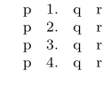 \startitemize[n] \starttabulate[|||||] \NC p \NC \itemtag \NC q \NC r \NC \NR \NC p \NC \itemtag \NC q \NC r \NC \NR \NC p \NC \itemtag \NC q \NC r \NC \NR \NC p \NC \itemtag \NC q \NC r \NC \NR \stoptabulate \stopitemize