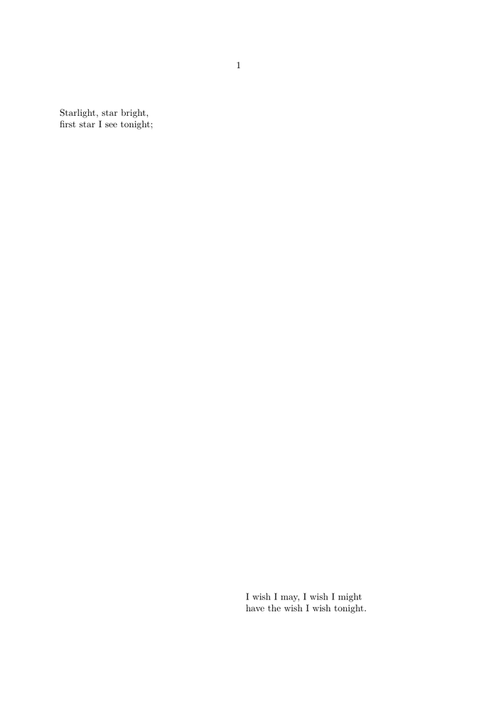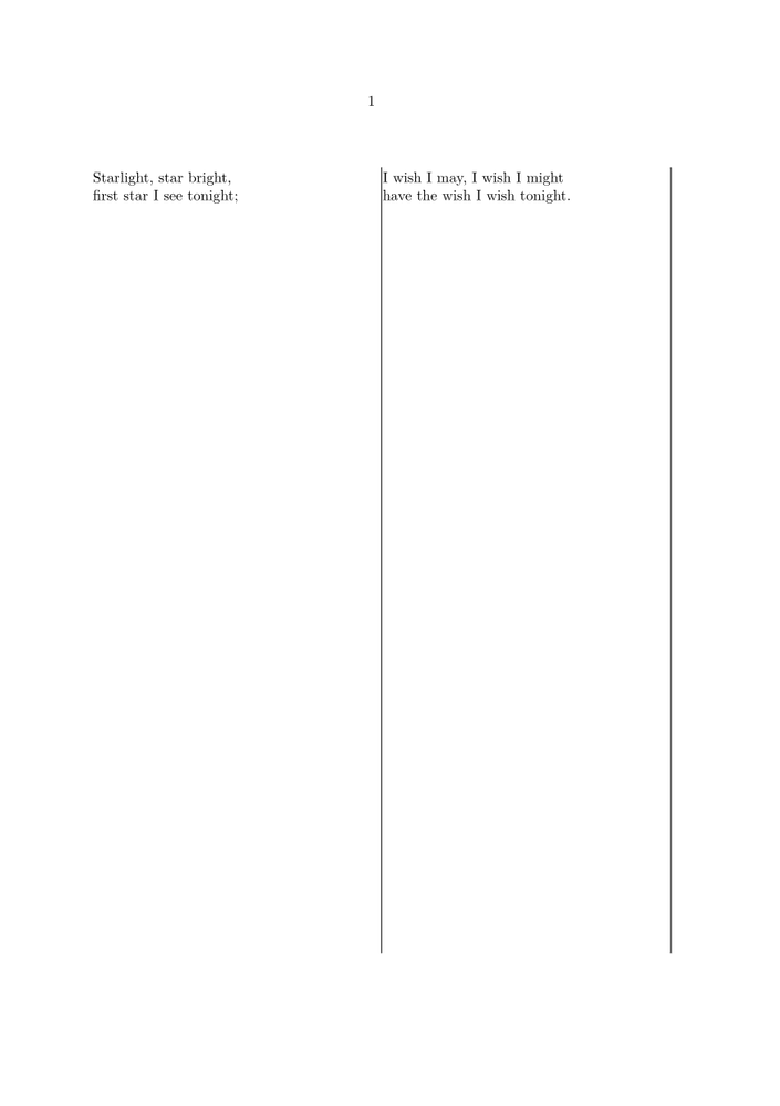 \setuppapersize[A5] \definecolumnset[TwoColumns][n=2] \starttext \startcolumnset[TwoColumns] \startlines % enforce line breaks Starlight, star bright, first star I see tonight; \stoplines \column \startlines I wish I may, I wish I might have the wish I wish tonight. \stoplines \stopcolumnset \stoptext