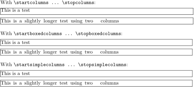 With \type{\startcolumns ... \stopcolumns}: \blank[medium] \startframed[offset=0pt] \startcolumns This is a test \stopcolumns \stopframed \blank[medium] \startframed[offset=0pt] \startcolumns This is a slightly longer test using two columns \stopcolumns \stopframed \blank[big] With \type{\startboxedcolumns ... \stopboxedcolumns}: \blank[medium] \startframed[offset=0pt] \startboxedcolumns This is a test \stopboxedcolumns \stopframed \blank[medium] \startframed[offset=0pt] \startboxedcolumns This is a slightly longer test using two columns \stopboxedcolumns \stopframed \blank[big] With \type{\startsimplecolumns ... \stopsimplecolumns}: \blank[medium] \startframed[offset=0pt] \startsimplecolumns This is a test \stopsimplecolumns \stopframed \blank[medium] \startframed[offset=0pt] \startsimplecolumns This is a slightly longer test using two columns \stopsimplecolumns \stopframed