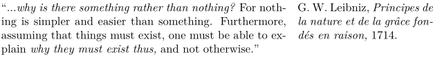 \setuppapersize[A5] \defineparagraphs[TwoThird][n=2] % The width of the second paragraph is automatically calculated if unspecified. \setupparagraphs[TwoThird][1][width=.66\textwidth] \startTwoThird \quotation{...{\it why is there something rather than nothing?} For nothing is simpler and easier than something. Furthermore, assuming that things must exist, one must be able to explain {\it why they must exist thus,} and not otherwise.} \nextTwoThird G. W. Leibniz, {\it\fr Principes de la nature et de la grâce fondés en raison,} 1714. \stopTwoThird
