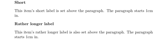 \definedescription[latexdesc][ headstyle=bold, style=normal, align=flushleft, alternative=hanging, width=broad, margin=1cm] \latexdesc{Short} This is a shorter item label, and some text that talks about it. The text is wrapped into a paragraph, with successive lines indented. \latexdesc{Rather longer label} This is a longer item label. As you can see, the text is not started a specified distance in -- unlike with other lists -- but is spaced a fixed distance from the end of the label.