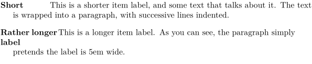 \documentclass{article} \begin{document} \begin{description} \item[Short] This is a shorter item label, and some text that talks about it. The text is wrapped into a paragraph, with successive lines indented. \item[Rather longer label] This is a longer item label. As you can see, the text is not started a specified distance in -- unlike with other lists -- but is spaced a fixed distance from the end of the label. \end{description} \end{document}