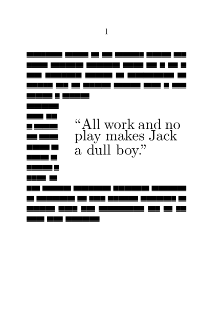 \setuppapersize[A7] \usemodule[visual] % For \fakewords \definefloat % Define a new type of float [pullquote] [pullquotes] \setupcaption % Set it to have no captions [pullquote] [location=none] \defineframedtext % Define a new type of framed text [pullquote] % with no visible frame [frame=off] \starttext \fakenwords{30}{2} \placepullquote[right]{}{ \startpullquote[width=4cm] \tfc “All work and no play makes Jack a dull boy.” \stoppullquote} \fakenwords{30}{1} \stoptext