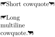 \definedelimitedtext[cowsay][ left={\mirror{\externalfigure[cow][height=1.5ex]}}, right={\externalfigure[cow][height=1.5ex]}, location=paragraph, ] \setupbodyfont[big] \cowsay{Short cowquote} \blank \startcowsay Long multiline cowquote. \stopcowsay