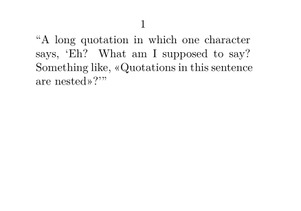 \setuppapersize[A8,landscape] \setupdelimitedtext % set up first quotation level [quotation:1] [left={\symbol[leftquotation]}, right={\symbol[rightquotation]}] \setupdelimitedtext % set up second quotation level [quotation:2] [left={\symbol[leftquote]}, right={\symbol[rightquote]}] \setupdelimitedtext % set up all other quotation levels [quotation] [left={«}, right={»}] \starttext \quotation{A long quotation in which one character says, \quotation{Eh? What am I supposed to say? Something like, \quotation{Quotations in this sentence are nested}?}} \stoptext