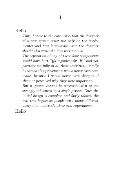 \setuppapersize[A7] %\setupdelimitedtext % [blockquote] % [style={\setupbodyfont[small]}] \setupdelimitedtext [blockquote] [style=\slx, before={\setupinterlinespace[line=2.4ex]}] \starttext Hello \startblockquote \input knuth %\par \stopblockquote Hello \stoptext
