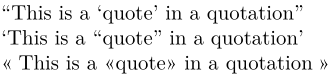 \setupbodyfont[big] \language[en-us] \quotation{This is a \quote{quote} in a quotation} \language[en-gb] \quotation{This is a \quote{quote} in a quotation} \language[fr] \quotation{This is a \quote{quote} in a quotation}