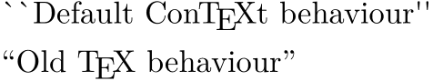 \tfd ``Default \ConTeXt{} behaviour'' \blank[line] \definefontfeature[TeX][default][tquo=yes, trep=yes] \feature[+][TeX] ``Old \TeX{} behaviour''