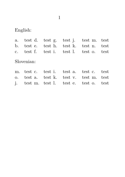 \setuppapersize[A7] \def\mojcaniannumber#1% {\ifcase#1 \or m\or o\or j\or c\or a\or m\or i\or k\or l\or a\or v\or e\or c\else \expandafter \mojcaniannumber \expandafter{\the\numexpr#1-13\relax}\fi} \defineconversion[sl][a][\mojcaniannumber] \starttext English: \startitemize[a,columns,five,packed,broad] \dorecurse{15}{\item test\endgraf} \stopitemize Slovenian: \language[sl] \startitemize[a,columns,five,packed,broad] \dorecurse{15}{\item test\endgraf} \stopitemize \stoptext