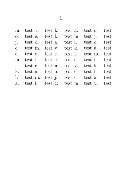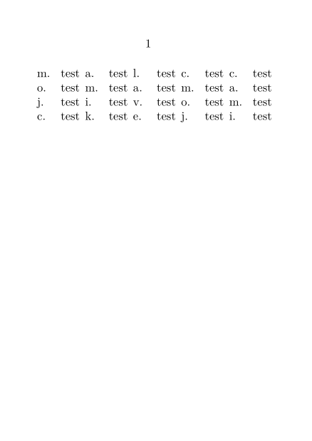 \setuppapersize[A7] \defineconversion[s][m, o, j, c, a, m, i, k, l, a, v, e, c] \starttext \startitemize[s,columns,five,packed,broad] \dorecurse{20}{\item test\endgraf} \stopitemize \stoptext