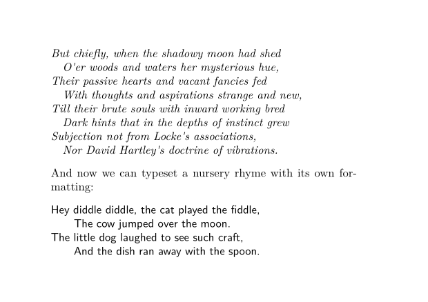 \setuppapersize[A7, landscape] \setuppagenumbering[location=none] \definelines[ottavaRima] [indenting={yes, small, even}, style=italic] \definelines[nurseryRhyme] [indenting={yes, big, even}, style=sansserif] \starttext \startottavaRima But chiefly, when the shadowy moon had shed O'er woods and waters her mysterious hue, Their passive hearts and vacant fancies fed With thoughts and aspirations strange and new, Till their brute souls with inward working bred Dark hints that in the depths of instinct grew Subjection not from Locke's associations, Nor David Hartley's doctrine of vibrations. \stopottavaRima And now we can typeset a nursery rhyme with its own formatting: \startnurseryRhyme Hey diddle diddle, the cat played the fiddle, The cow jumped over the moon. The little dog laughed to see such craft, And the dish ran away with the spoon. \stopnurseryRhyme \stoptext