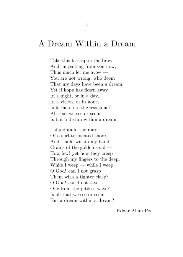 \setuppapersize[A6] \setuphead[title][align=middle] \def\startpoem[#1]% {\begingroup \setbox0\hbox{#1}% \setupnarrower[left=\dimexpr(\the\hsize-\the\wd0)/2\relax]% \startnarrower[left]% \startlines} \def\stoppoem {\stoplines \stopnarrower \endgroup} \starttext %----------------------------------------- \title{A Dream Within a Dream} % Pass the longest line as the argument. \startpoem[That my days have been a dream;] \input poe \stoppoem \hfill Edgar Allan Poe \stoptext