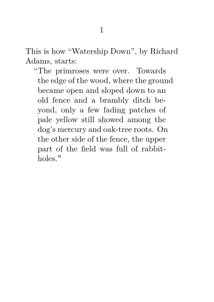 \setuppapersize[A7] \starttext This is how \quotation{Watership Down}, by Richard Adams, starts: \startquotation The primroses were over. Towards the edge of the wood, where the ground became open and sloped down to an old fence and a brambly ditch beyond, only a few fading patches of pale yellow still showed among the dog's mercury and oak-tree roots. On the other side of the fence, the upper part of the field was full of rabbit-holes. \stopquotation \stoptext