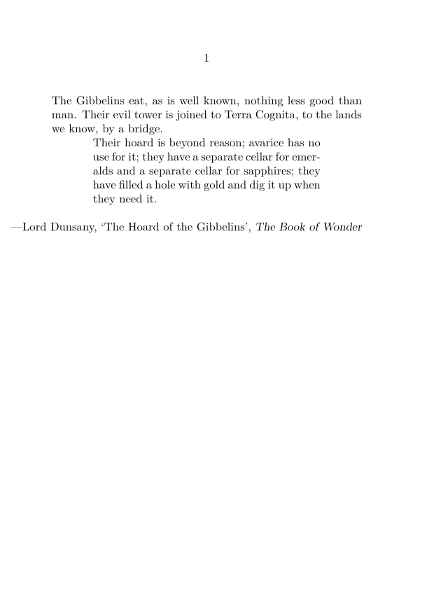 \setuppapersize[A6] \starttext The Gibbelins eat, as is well known, nothing less good than man. Their evil tower is joined to Terra Cognita, to the lands we know, by a bridge. \definenarrower[MyNarrow][left=1cm,right=1cm] \startMyNarrow[left,right] Their hoard is beyond reason; avarice has no use for it; they have a separate cellar for emeralds and a separate cellar for sapphires; they have filled a hole with gold and dig it up when they need it. \stopMyNarrow \blank[line] \rightaligned{—Lord Dunsany, \quote{The Hoard of the Gibbelins}, \emph{The Book of Wonder}} \stoptext