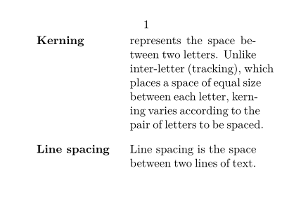 \setuppapersize[A8,landscape] \starttext \definedescription[Typography] \startTypography{Kerning} represents the space between two letters. Unlike inter-letter (tracking), which places a space of equal size between each letter, kerning varies according to the pair of letters to be spaced. \stopTypography \startTypography{Line spacing} Line spacing is the space between two lines of text. \stopTypography \stoptext