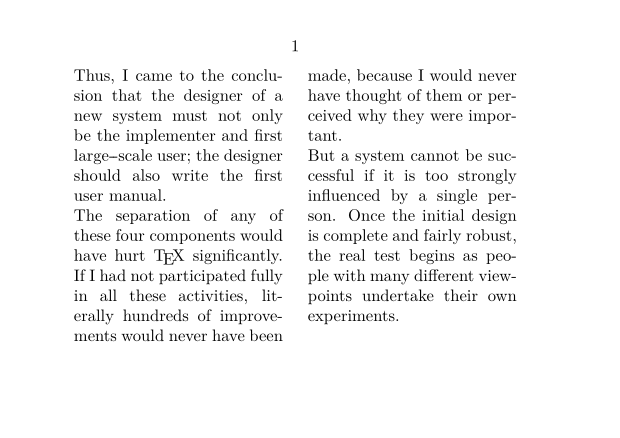 \setuppapersize[A7,landscape] \setupbodyfont[8pt] \setupalign[verytolerant] \starttext \startcolumns[n=2] \input knuth \stopcolumns \stoptext