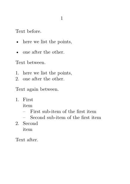 \setuppapersize[A7] \starttext Text before. \startitemize \item here we list the points, \item one after the other. \stopitemize Text between. \startitemize[n,packed] \item here we list the points, \item one after the other. \stopitemize Text again between. \startitemize[n,packed] \starthead{First} item \startitemize[packed] \startitem First sub-item of the first item \stopitem \startitem Second sub-item of the first item \stopitem \stopitemize \stophead \starthead{Second} item \stophead \stopitemize Text after. \stoptext