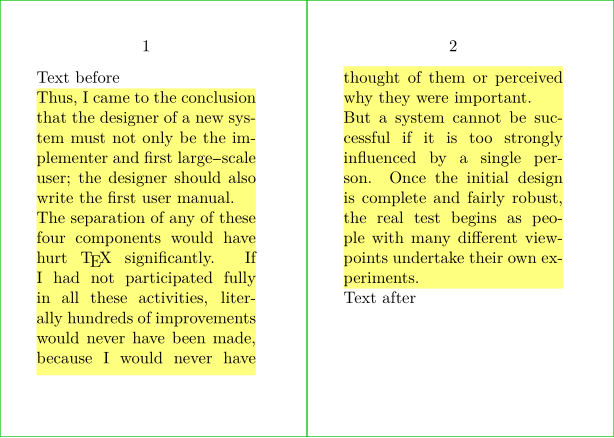 \definepapersize[sheet][width=104mm,height=74mm] \setuppapersize[A8][sheet] \setuppaper[nx=2,ny=1] \setuparranging[XY] \showframe[edge] \setupalign[tolerant] \definetextbackground [MyTextBackEnv] [location=paragraph, background=color, backgroundcolor=lightyellow, frame=off,] \starttext Text before \startMyTextBackEnv \samplefile{knuth} \stopMyTextBackEnv Text after \stoptext