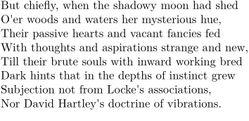 \startlines But chiefly, when the shadowy moon had shed O'er woods and waters her mysterious hue, Their passive hearts and vacant fancies fed With thoughts and aspirations strange and new, Till their brute souls with inward working bred Dark hints that in the depths of instinct grew Subjection not from Locke's associations, Nor David Hartley's doctrine of vibrations. \stoplines