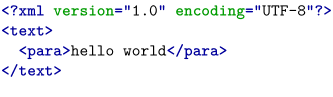 \starttyping[option=xml] <?xml version="1.0" encoding="UTF-8"?> <text> <para>hello world</para> </text> \stoptyping