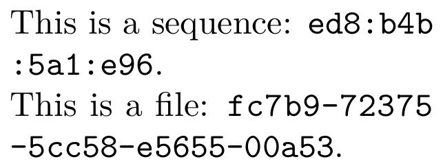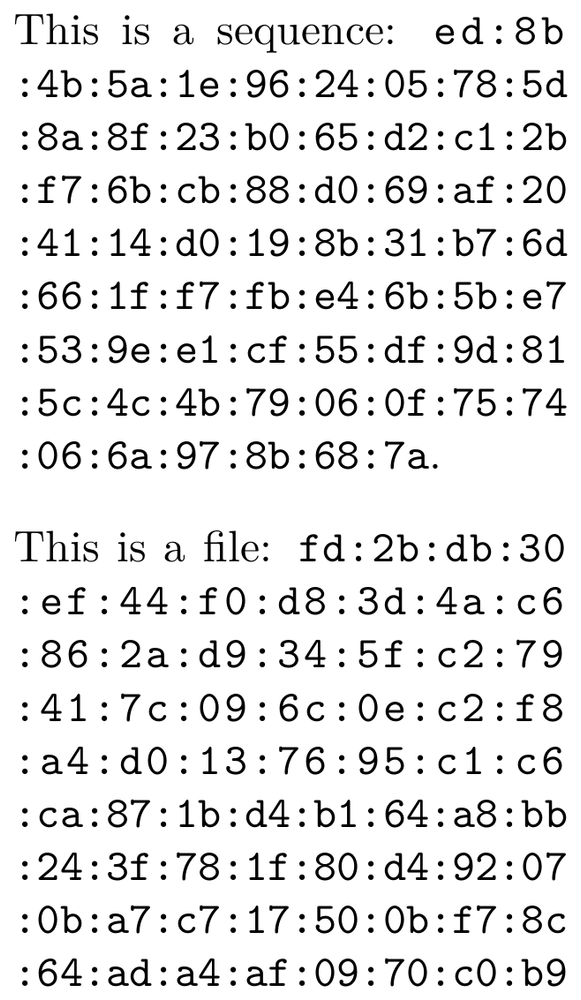 \startluacode require("util-sha") function document.coloniter(str) local n = 0 for c in str:gmatch("..") do if n > 0 then context((":%s"):format(c)) else context(c) end n = n + 1 end end \stopluacode \unexpanded\def\hsa[#1]% {{\tt\hyphenatedurl% {\ctxlua{document.coloniter(utilities.sha2.hash512("#1"))}}}} \unexpanded\def\hsafile[#1]% {\doiffileelse{#1}{{\tt\hyphenatedurl {\ctxlua{document.coloniter(utilities.sha2.hash512(io.loaddata("#1")))}}}} {{\bfd\color[red]{\type{#1} not available!!!}}}} \setupbodyfont[24pt] \startTEXpage[offset=1dk] This is a sequence: \hsa[This is a sequence]. \blank This is a file: \hsafile[\jobname.tex] \stopTEXpage