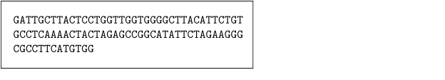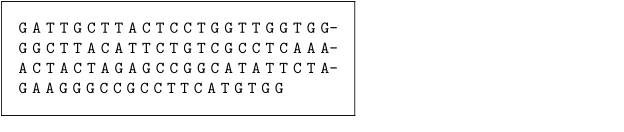 \define[1]\DNA{\handletokens #1\with\DNAspacer} \define[1]\DNAspacer{#1\hskip 2.3pt plus .1pt} \startframedtext[width=6cm,style=mono] \DNA{GATTGCTTACTCCTGGTTGGTGGGGCTTACATTCTGTCGCCTCAAAACTACTAGAGCCGGCATATTCTAGAAGGGCCGCCTTCATGTGG} \stopframedtext