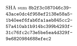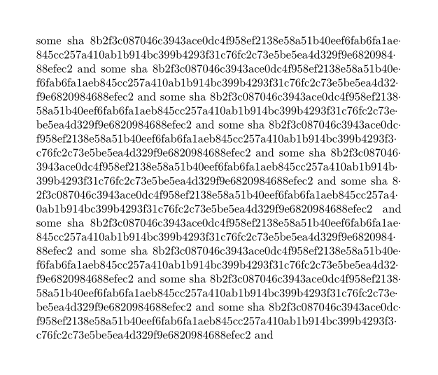 \define[1]\SHA{{\tt\handletokens #1\with\SHABreak}} \define[1]\SHABreak{#1\softhyphen\hskip 0pt} \startTEXpage[offset=1em, width=15em] SHA sum \SHA{8b2f3c087046c3943ace0dc4f958ef2138e58a51b40e% ef6fab6fa1aeb845cc257a410ab1b914bc399b4293f% 31c76fc2c73e5be5ea4d329f9e6820984688efec2} \stopTEXpage