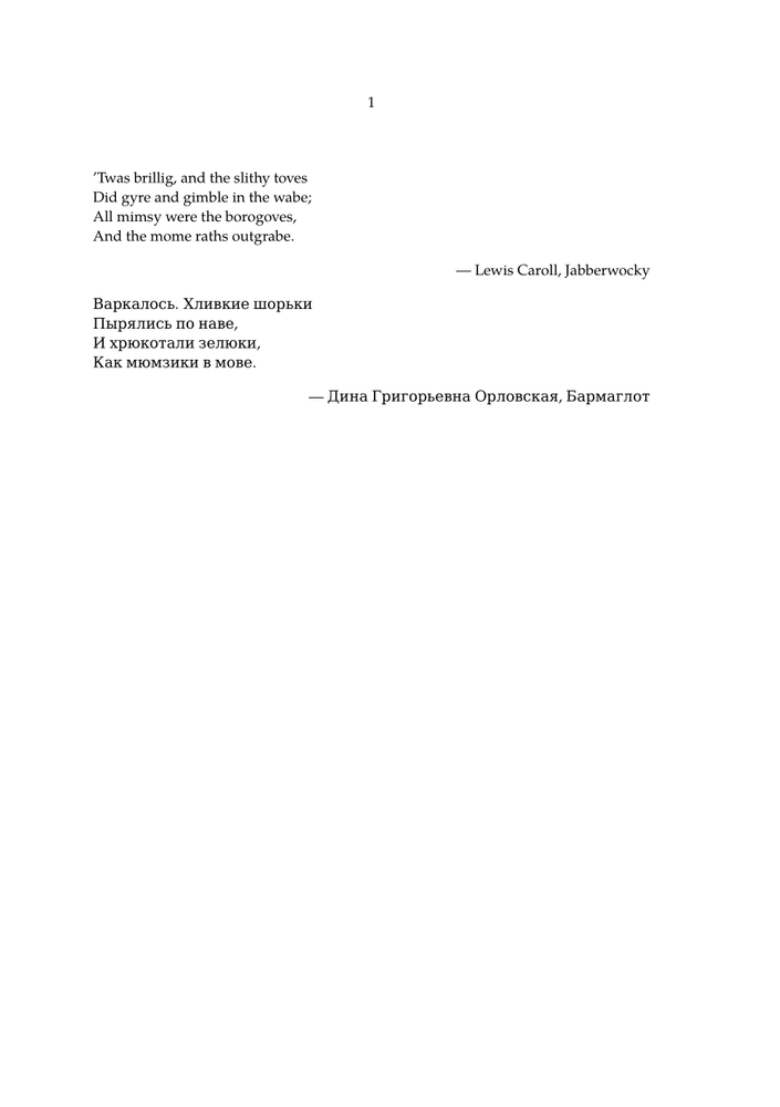 \definefallbackfamily [mainface] [rm] [DejaVu Serif] [range=cyrillic] \definefontfamily [mainface] [rm] [TeX Gyre Pagella] \setupbodyfont [mainface] \starttext \startlines ’Twas brillig, and the slithy toves Did gyre and gimble in the wabe; All mimsy were the borogoves, And the mome raths outgrabe. \stoplines \rightaligned {— Lewis Caroll, Jabberwocky} \startlines Варкалось. Хливкие шорьки Пырялись по наве, И хрюкотали зелюки, Как мюмзики в мове. \stoplines \rightaligned {— Дина Григорьевна Орловская, Бармаглот} \stoptext